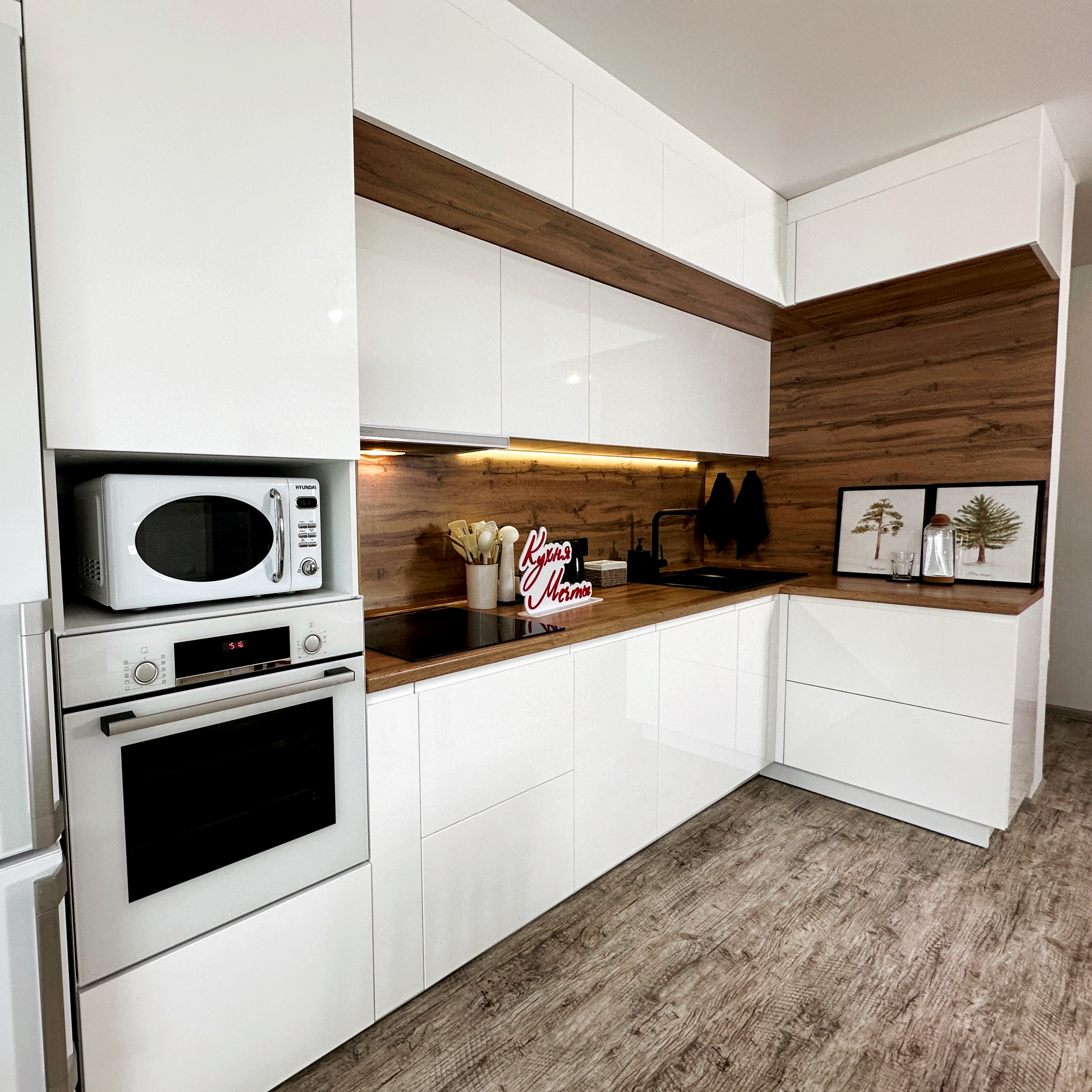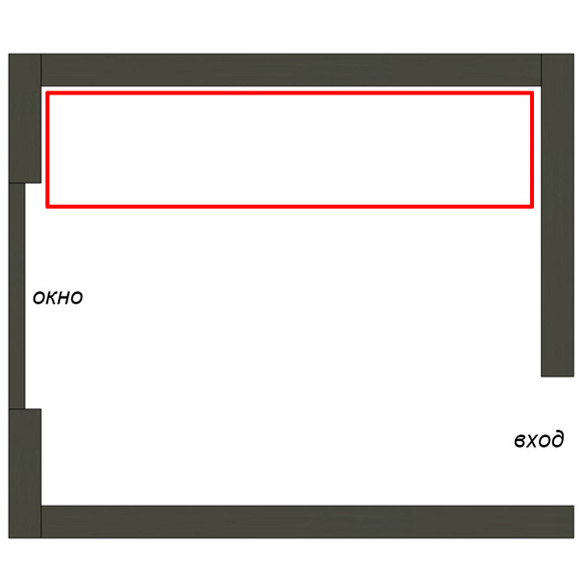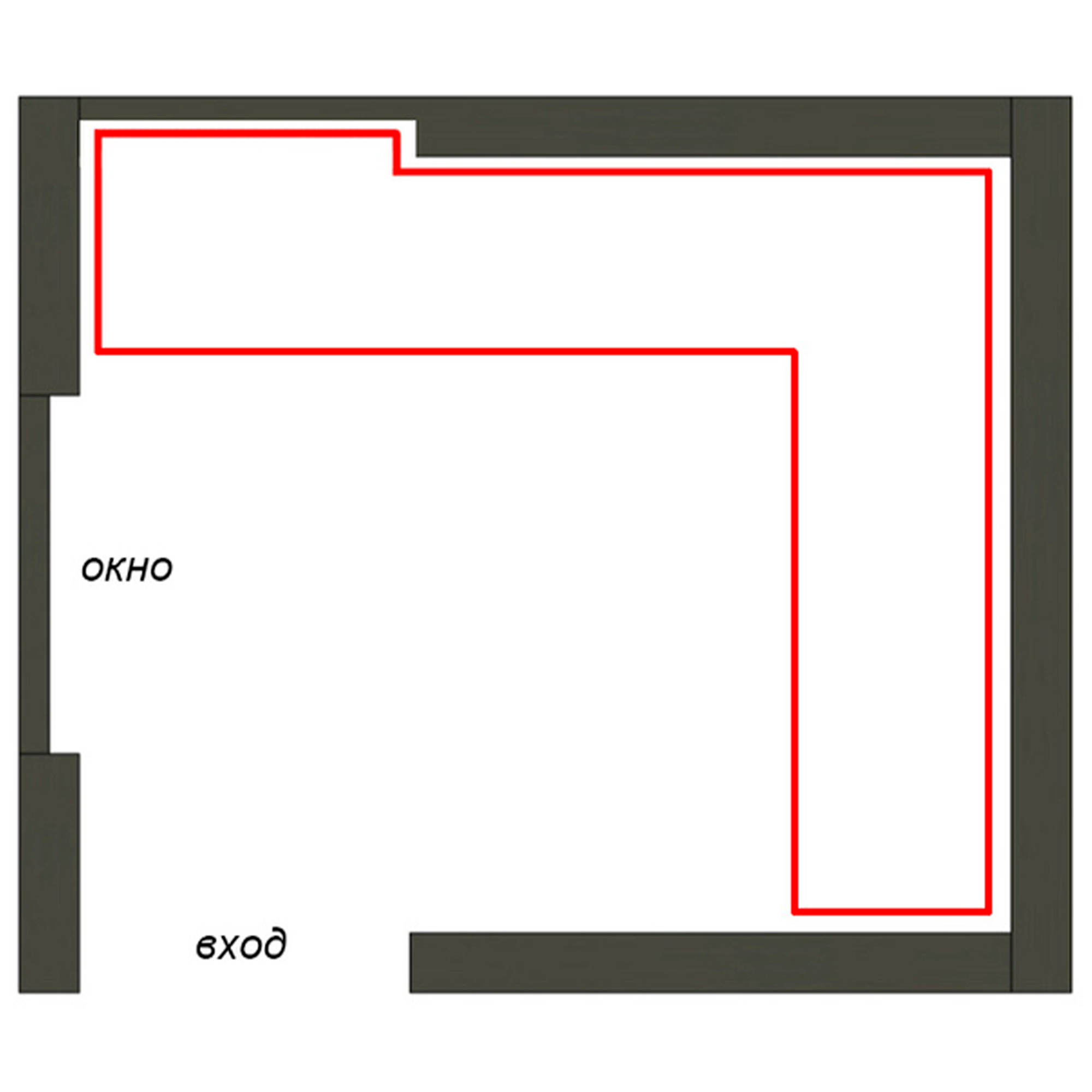 Кухня точно в размер помещения - стык в стык. Без щелей и зазоров, чётко по уровню. Даже если у вас кривые стены!